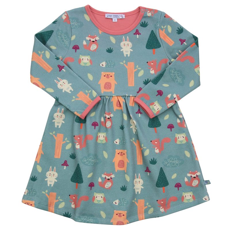 Gemütlich und schick! Kuscheliges Sweatkleid in hellem türkis und mit niedlichem Waldtieredruck.