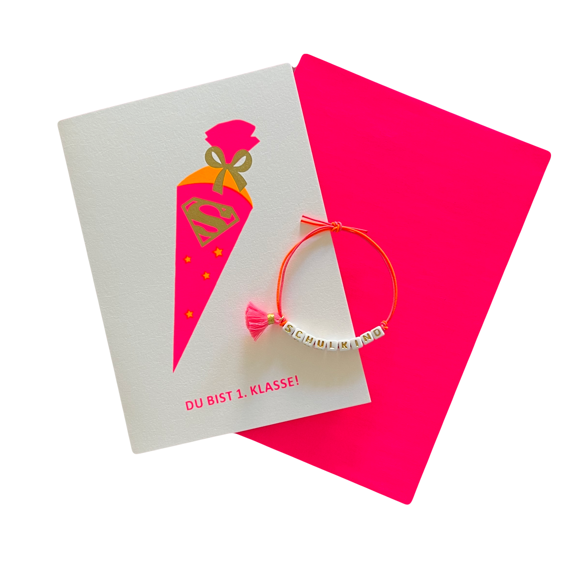 Hochwertige Klappkarte zur Einschulung im Siebdruck erstellt.  Die Aussenkante ist in Neon Pink von Hand bemalt. Mit einem Armband für den perfekten Schulstart (Perlen mit Schriftzug SCHULKIND). Band elastisch, daher easy zum an- und ausziehen.